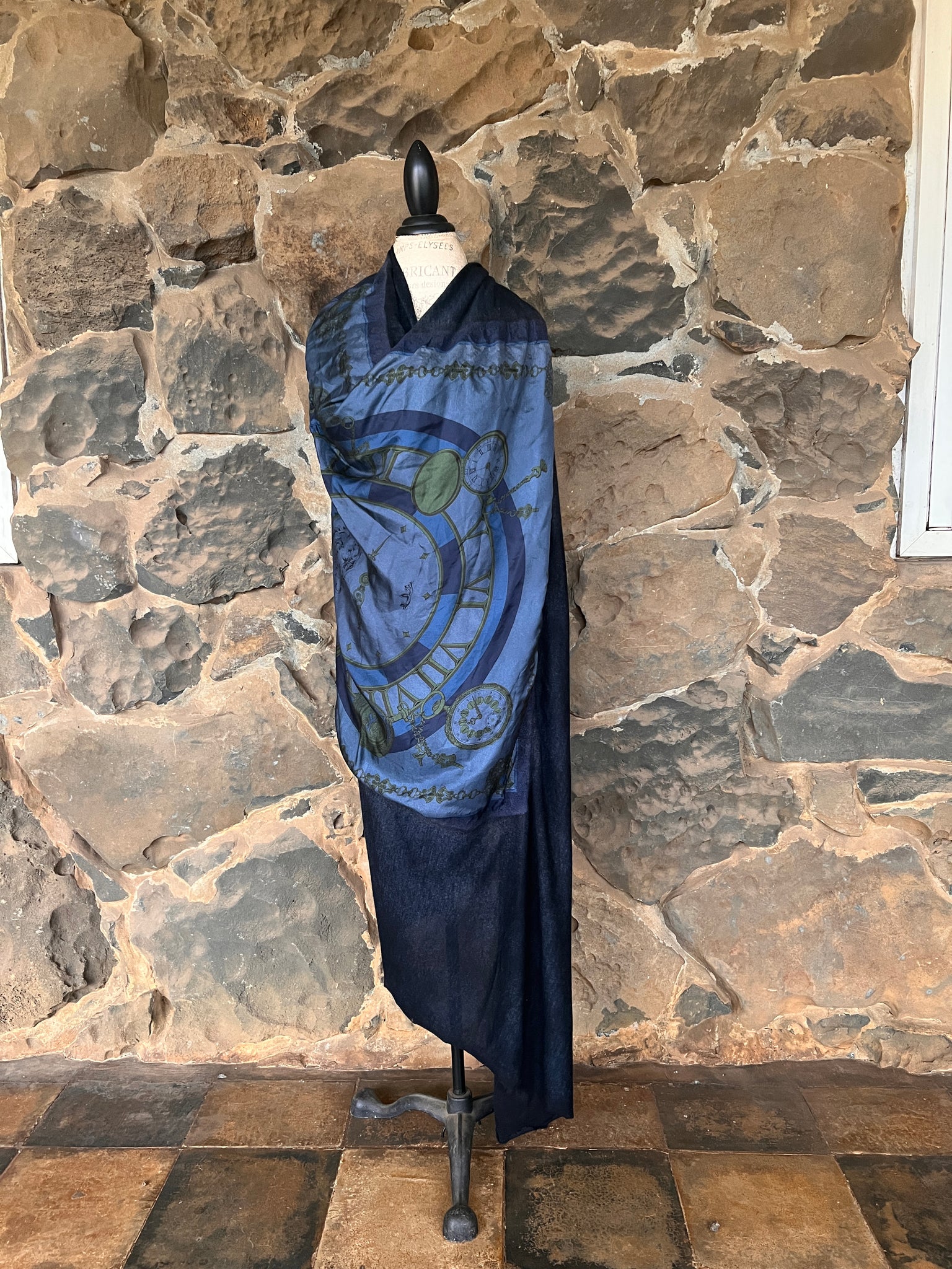 Large unisex knitted cashmere scarf with silk scarf center featuring clocks in blue with gold accents.