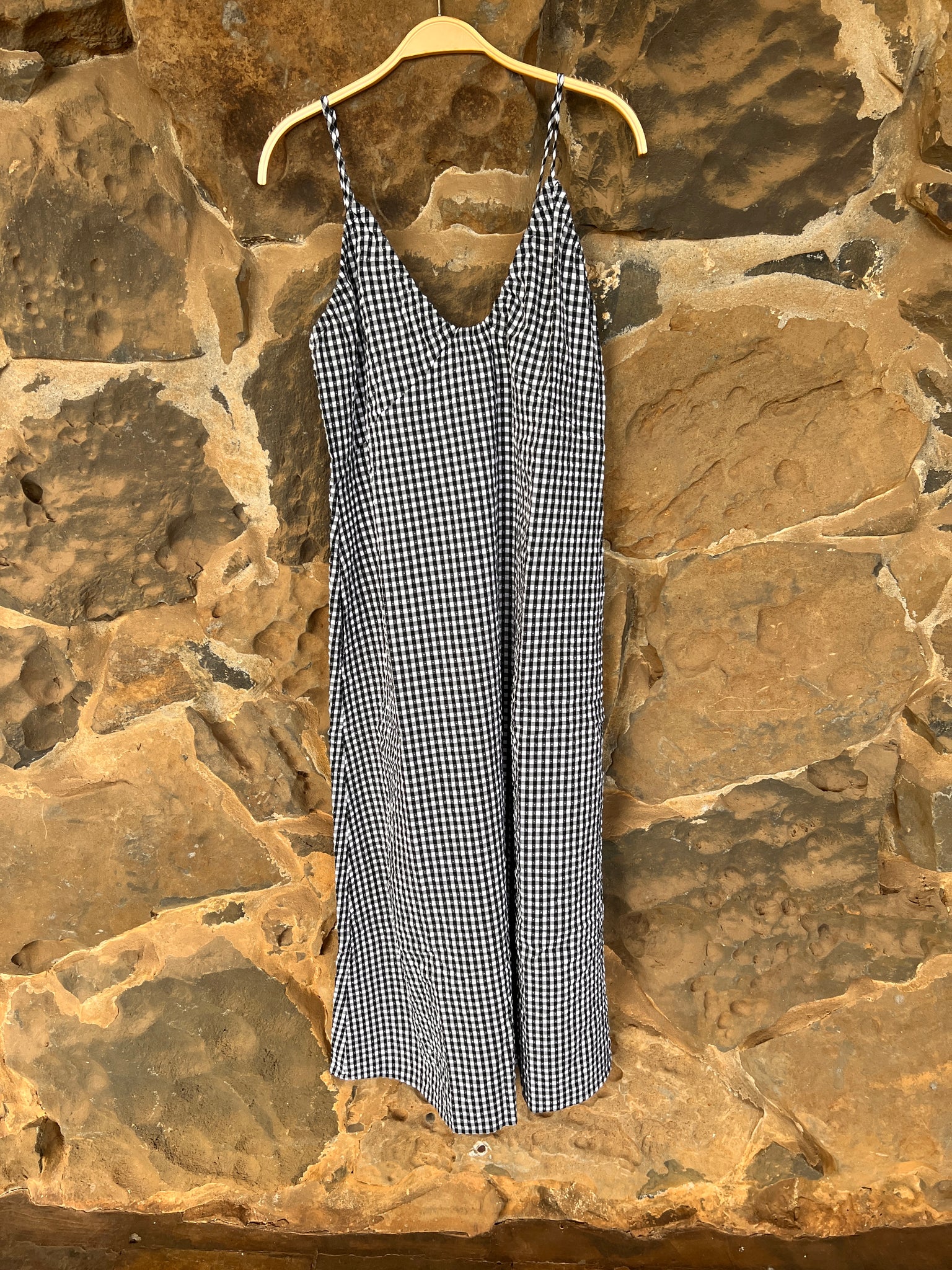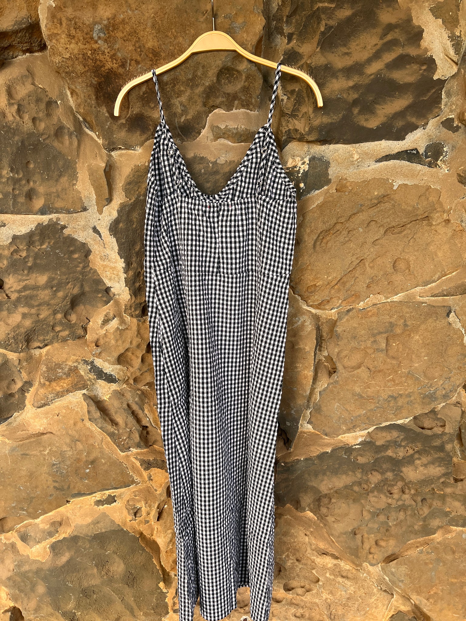 Black and white gingham for the win this summer! Hana is constructed from lightweight, breathable cotton fabric. V neck front with adjustable straps and mid to ankle length. Elastic back for a more fitted look.