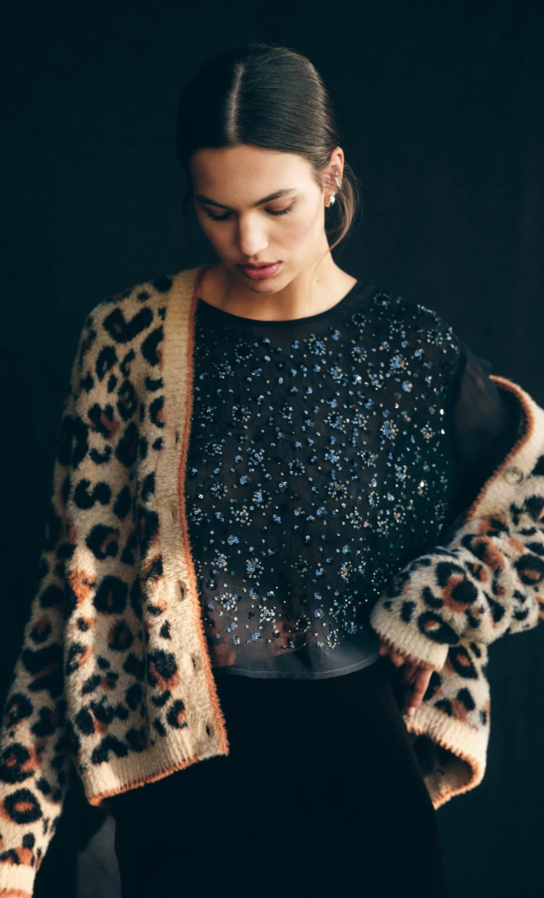 Featuring sequins and beaded embellishments on the front and back with decorative side ties, this top offers a festive yet sophisticated touch. Crafted from sheer viscose with a detachable camisole underneath and a single keyhole closure at the back, it’s perfect for holiday gatherings or dressy occasions.