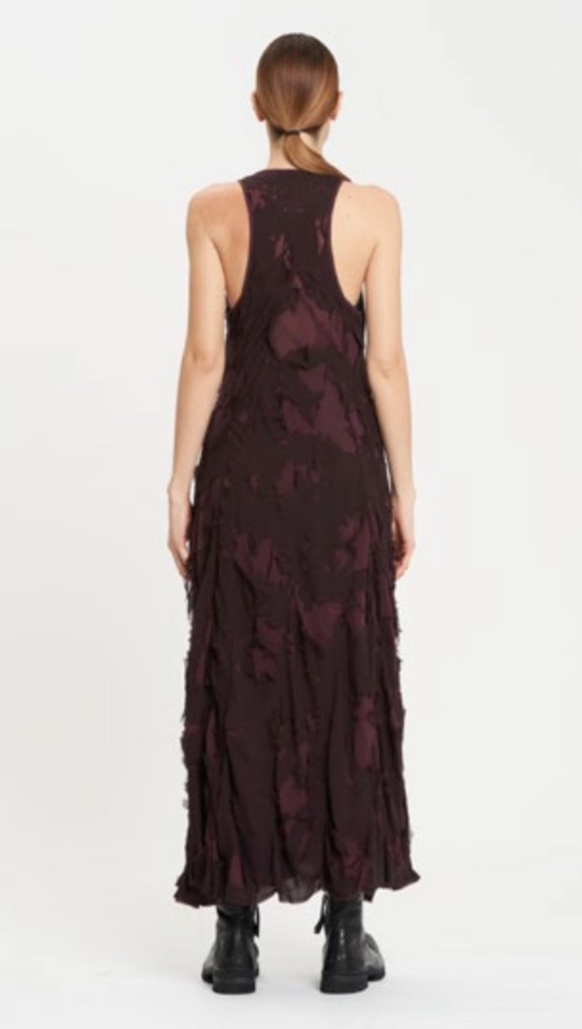 Shredded silk dress with round collar and racer back styling. Black, viscose petticoat included. Raw hem and distressed patchwork of shredded silk.