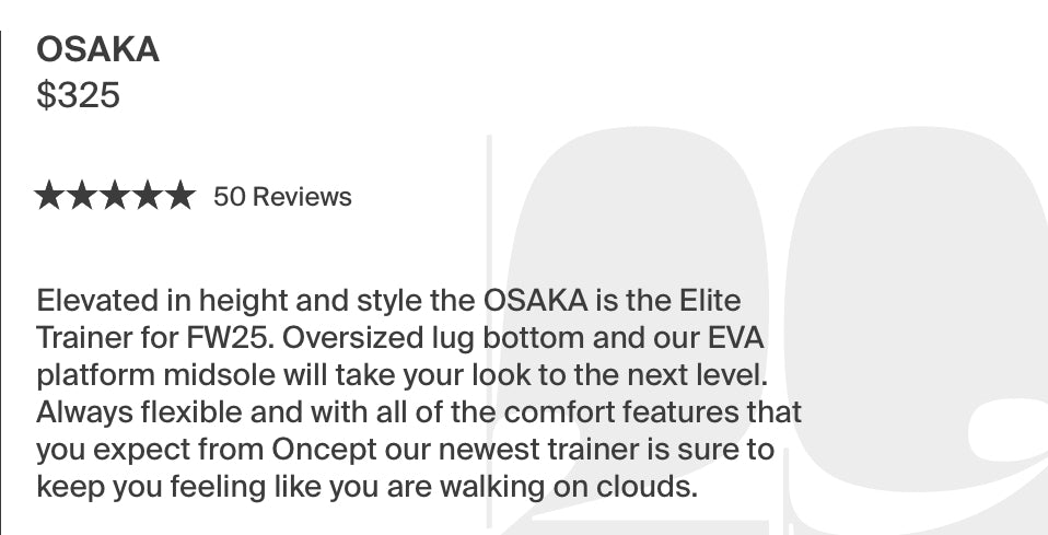 Elevated in height and style, the Osaka is the elite trainer. Oversized lug bottom and Ocept’s EVA platform midsole will take your look to the next level. Always flexible and with all of the comfort features that you expect from Oncept. You will feel like you’re walking on clouds!