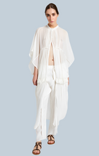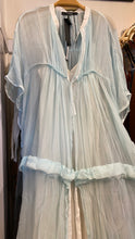Very sheer with hand sewn details and linen tie at below waist and buttons.