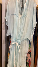 Pure washed silk chiffon in a pretty, soft, robin’s egg blue. Round neckline, with little pleats at front and back. Drop should short sleeve. Beautiful shirt or fabulous dress...you decide.