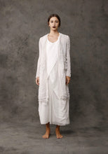 Long linen/cotton coat, 2 pockets in one side, hand painted ton sur ton, with “creased and dirty” effect.in the back, a longer gauze cotton tail appear from the split